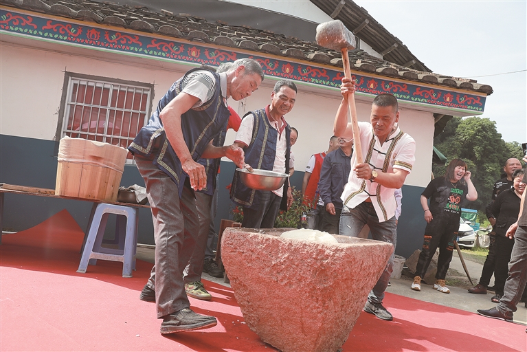 “打糍粑喽!”在美食区,村里的男女老少纷纷上阵,打起了糍粑,现场洋溢着喜庆的氛围。晶莹油亮的乌米饭,软糯可口的九稳包,口感饱满的牛角粽……各种地道的畲族美食令人食指大动,带领游客们开启了一趟“舌尖上的畲乡”之旅。
