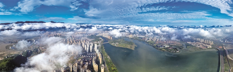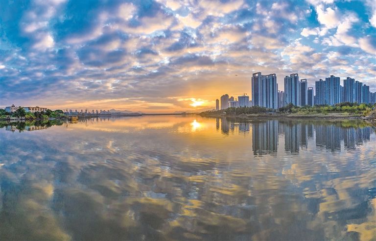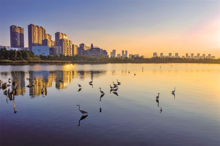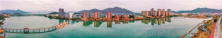 那天,天高云淡,视野开阔。站在白鹤岭山顶极目天际,宁川秀色一览无余。镜台山、蓝田山、山兜亭山,三山列阵成一道龙脉,逶迤前行,护卫城池;塔山、大门山、金蛇山,如三幅硕大盆景,点缀城中,让绵绵绿意流淌高楼大厦间;日月台、靖海楼、如意塔,三点一线,连贯古今,诉说盛世,令人思接千载,感慨万端。这三处也成了城池新地标。由黑污水面改造成的东湖,如一面天赐明镜落在城中,色如翡翠,水光潋滟,芦荻轻荡,鸥鹭低飞。绿水青山的交融映衬,让城市充满生气,灵动飘然。
