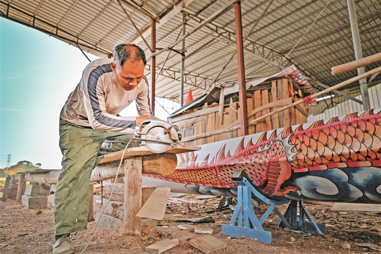 刘朝忠喜欢看自己的作品在江里风驰电掣。“一般要提前半个月把龙舟做好,再下到江里‘试驾’,有时候我也会亲自为它试水。”龙舟就像他的“孩子”,看着一条龙舟的“显形”,再看它慢慢下水,他成就感十足。