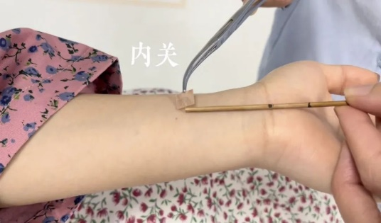 揿针,属于皮内针的一种,因形似揿钉,故名揿钉型皮内针,简称揿针,是将特制的小型针具固定在腧穴部位的皮内或皮下做较长时间留针的一种方法。其具有见效快、操作便捷、适用性强、方便病人行动等特点,用于药物流产患者,取穴内关、合谷、三阴交留针,对于减轻排胎疼痛,缓解药物恶心、头晕等副作用效果显著。