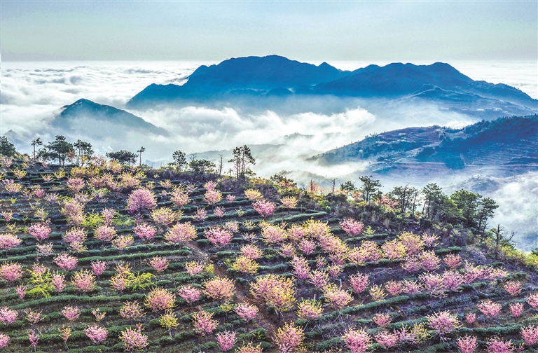 从山脚一路向上,只见漫山遍野的茶垄锦簇成行,一行行一层层伸向山的深处,颇为壮观。茶垄之间,一棵棵花木错落排列,海棠、含笑、桃树、桂花等迎风招展,更加令人心醉。