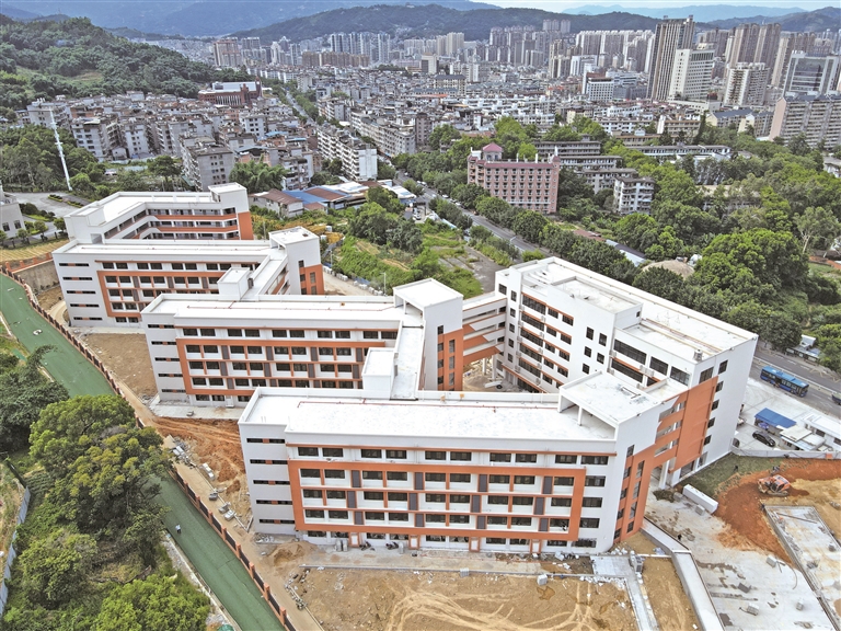 7月4日,在蕉城区第七中心小学新校区项目建设现场,主体工程已全部完工(如图),工人正进行室外场地平整、室外管道、绿化工程等施工。该项目将于月底完成竣工验收,8月份正式投入使用。